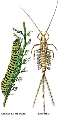 À l'exception d'un petit groupe de formes primitives (thysanoures, protoures, diploures, collemboles), les insectes sont ailés (ou descendent d'ancêtres ailés) et présentent des métamorphoses, incomplètes chez les paurométaboles et les hémimétaboles, complètes et comportant une nymphe immobile chez les holométaboles. Principaux ordres parmi les hétérométaboles : orthoptères, hémiptéroïdes, libellules ; parmi les holométaboles : diptères (mouches et moustiques), lépidoptères (papillons), coléoptères, hyménoptères (abeilles, fourmis…).