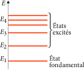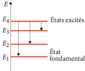 Pour représenter les différents niveaux d’énergie associés à un atome, on utilise un diagramme avec un axe vertical où sont spécifiés les niveaux d’énergie associés à l’atome : l’état de plus basse énergie est appelé état fondamental ; les états d’énergie supérieurs sont des états excités. À chaque état est associé une énergie (notée E) : l’atome ne peut prendre que des niveaux d’énergie bien déterminés (E1, E2, E3, E4…).