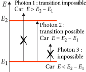 Pour passer d'un niveau d'énergie à un autre, un atome doit absorber un photon dont l’énergie est exactement égale à la différence d’énergie ΔE entre l’énergie de l’état excité et l’énergie de l’état fondamental. Si l’énergie du photon est supérieure ou inférieure à la différence d’énergie, l’atome ne peut pas absorber le photon et reste dans son état d’énergie fondamental :