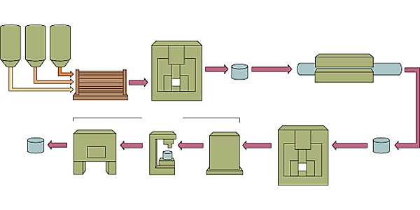Ensemble des procédés métallurgiques permettant d'obtenir des produits ou des pièces par densification de poudres métalliques.