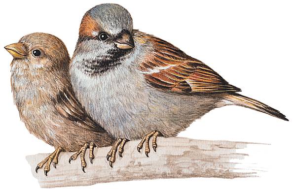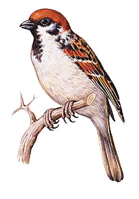 Le mâle du moineau domestique (Passer domesticus) porte une collerette noire. Le moineau se nourrit de graines, d'insectes et de fruits. Il a été introduit dans le monde entier. Il coexiste partout en France et en Eurasie avec le friquet.