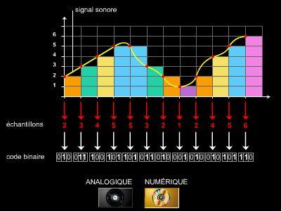 Dans la technologie numérique, les objets à traiter (image, son, signal) sont représentés par des suites de nombres binaires. Cette représentation nécessite d'acquérir des valeurs représentatives de l'objet initial, par exemple, pour un signal continu, des mesures faites à intervalles réguliers, de la valeur de l'amplitude du signal. Cet échantillonnage est le plus souvent suivi d'une quantification des valeurs trouvées, qui consiste à leur substituer des valeurs binaires les plus proches possibles des valeurs initiales. La représentation est d'autant plus fidèle que la fréquence d'échantillonnage est élevée et que la marge entre les valeurs binaires de quantification est étroite. Mais la fidélité de la représentation se traduit par une quantité importante d'informations, ce qui implique de trouver un compromis, pour rester dans des tailles de fichiers ou des débits de transmission acceptables.