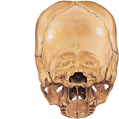 Os impair et médian formant la partie postérieure et inférieure du crâne, l'occipital est traversé par le trou occipital. Il comprend une partie antérieure, ou corps, ou apophyse basilaire ; deux masses latérales, qui s'articulent avec l'atlas par l'intermédiaire des condyles occipitaux ; une partie postérieure, ou « écaille », qui s'articule en avant avec les deux pariétaux et où s'insèrent plusieurs muscles.