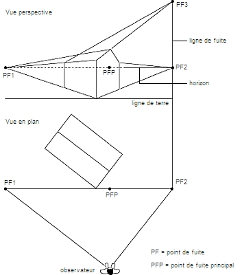 Le regard du spectateur peut être figuré par une pyramide, dite pyramide visuelle. La base de cette pyramide correspond, pour le dessinateur ou le spectateur, au plan figuratif, c'est-à-dire au dessin ou au tableau ; sa hauteur, ligne virtuelle issue du sommet, c'est-à-dire du point de vue, est dite rayon visuel principal. La ligne horizontale, virtuelle également, qui est perpendiculaire au rayon visuel sur le tableau, est la ligne d'horizon. Le point de vue et le rayon visuel principal déterminent la localisation sur la ligne d'horizon du point de fuite principal et des points de distance. Le bord inférieur du tableau est dit ligne de terre. Lorsque le point de vue est situé à une distance finie du tableau, la perspective est dite centrale. Dans le cas où il est rejeté à l'infini, on parle de perspective cavalière.