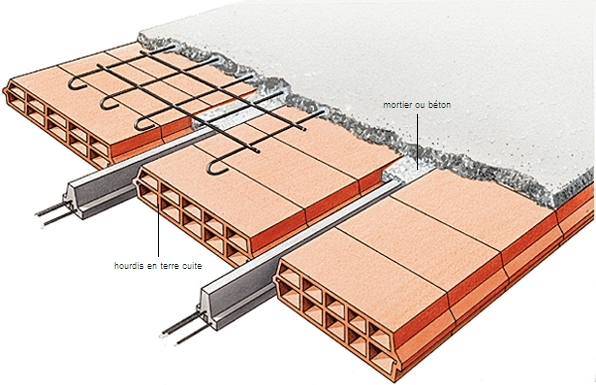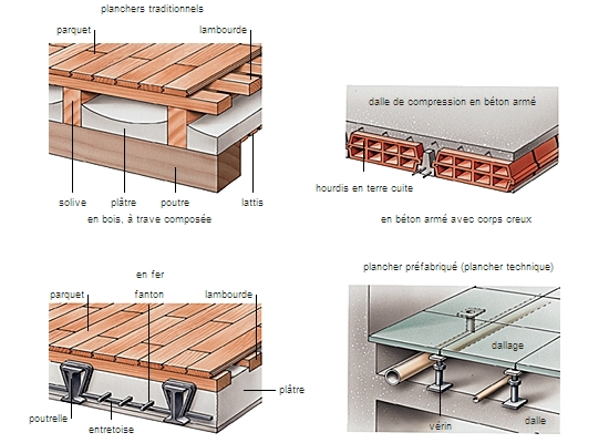 Les planchers sont généralement constitués par une ossature comprenant la partie portante ainsi que les hourdis de remplissage, par un revêtement, ou aire supérieure, constituant un sol, et par un plafond, ou aire inférieure. Les planchers traditionnels sont en bois (à solives jusqu'à une portée de 5 m, à poutres et solives au-delà), en fer (solives en fer à double T, hourdis en plâtras secs ou en briques creuses), ou en béton armé (simple dalle jusqu'à 4 m de portée, dalle nervurée au-delà). Les planchers préfabriqués peuvent être classés soit d'après leur matériau (béton armé, béton précontraint, poutrelles métalliques enrobées, céramique résistante), soit d'après leur mode de mise en œuvre (plancher à poutrelles jointives, sans entrevous, plancher à poutrelles non jointives avec dalle porteuse, plancher à solives préfabriquées avec coffrages perdus incorporés).