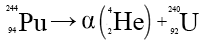 Les rayons α sont constitués de particules de masse égale à 4 fois la masse du proton et dont la charge électrique est le double de celle du proton : il s'agit de noyaux d'hélium. Toutes les particules issues d'une même espèce de noyaux radioactifs (en général de très gros noyaux) sont émises avec la même énergie. Cette émission provoque un changement de nature du noyau : le numéro atomique diminue de deux unités, la masse atomique, de quatre. Ainsi, lors de la désintégration α du plutonium 244, celui-ci se transforme en uranium 240, avec une demi-vie de 80 millions d'années :