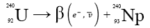 ), est émise en même temps que l'électron. Cette hypothèse a permis l'établissement de la théorie de l'interaction faible, qui régit la désintégration β. Celle-ci résulte donc de la désintégration de neutrons du noyau en protons, électrons et antineutrinos. Ainsi, lors de la désintégration de l'uranium 240 en neptunium (Np), seul le numéro atomique est affecté :