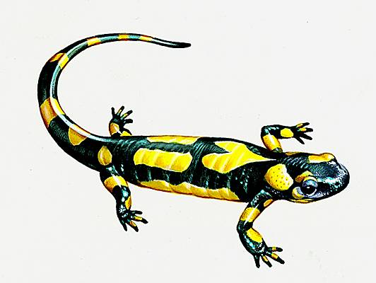 Amphibien urodèle vivipare, surtout insectivore, à peau luisante noire ou tachée de jaune vif, couverte d'un mucus venimeux. (Genre salamandra ; type de la famille des salamandridés.)