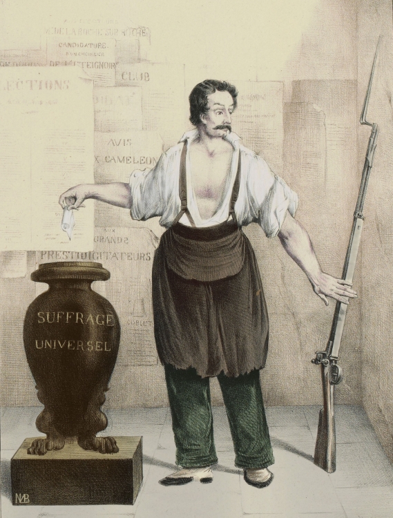 Pendant près d’un siècle, il ne s’agira cependant que d’un « suffrage universel masculin » : c'est seulement en 1944 que les femmes obtiendront le droit de vote en France, 75 ans après l'État américain du Wyoming, qui fut le premier à le leur reconnaître.