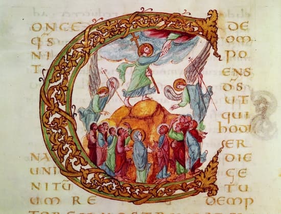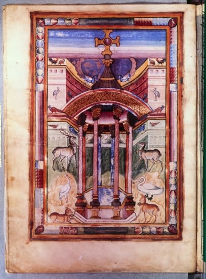 Plus complexe mais sans doute plus originale et plus féconde que la renaissance des lettres, celle des arts est également fille de l'Église, au service de laquelle travaillent enlumineurs, orfèvres, architectes et musiciens, pour aboutir à des réalisations emblématiques comme la Chapelle palatine d’Aix, d’inspiration italienne et byzantine, l’abbaye modèle de Centula/Saint-Riquier ou, dans le domaine de l’enluminure, l’Évangéliaire dit du couronnement et l’Évangéliaire d’Ebbon.