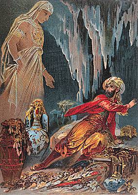 Aladin et le génie. Chromolithographie (XIXe siècle) pour Aladin ou la Lampe merveilleuse, un des contes des Mille et Une Nuits. (Collection particulière.)