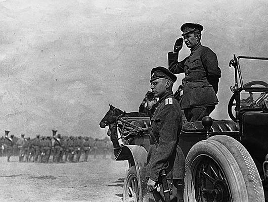 Le Russe Aleksandr Fedorovitch Kerenski (dans la voiture) passant les troupes en revue en 1917.