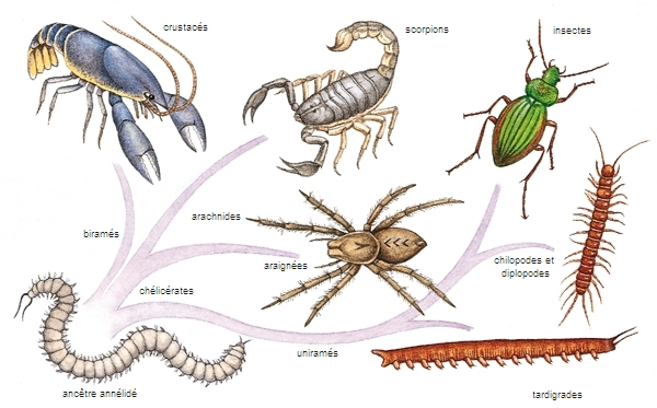 Selon ce schéma, largement admis, les arthropodes modernes évolueraient selon trois branches distinctes : les arthropodes à appendices biramés, les chélicérates et les arthropodes à appendices uniramés. Ces formes descendent probablement d'ancêtres ressemblant à des vers, ayant vécu il y a plus de 600 millions d'années.