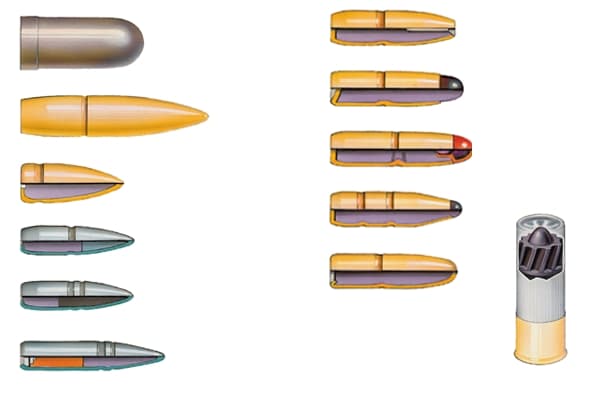 BallesBallesBalles de fusils de guerre (à gauche) et balles de fusils de chasse.Dessin Marcel Miller - Archives Larousse