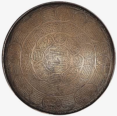 Coupelle de pharmacie en bronze moulé et ciselé, incrusté d'argent. Syrie, XIIIe-XIVe siècle. (Musée du Louvre, Paris.)