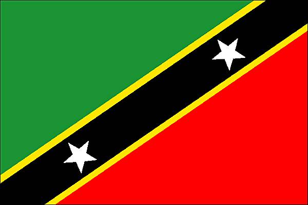 Drapeau de Saint-Kitts-et-Nevis.Formé de deux triangles, l'un vert, l'autre rouge, séparés par une large bande noire diagonale, bordée de jaune. Les étoiles symbolisent l'espoir et la liberté.