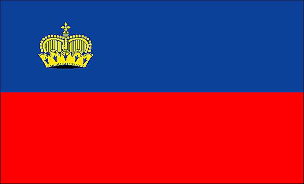 Drapeau du Liechtenstein.Adopté en 1937. Le bleu représente le ciel et porte en outre la couronne princière ; le rouge symbolise le feu.