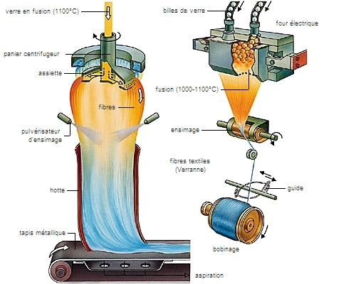 Fabrication des fibres de verreFabrication des fibres de verreSchéma de fabrication des fibres de verre.Archives Larousse