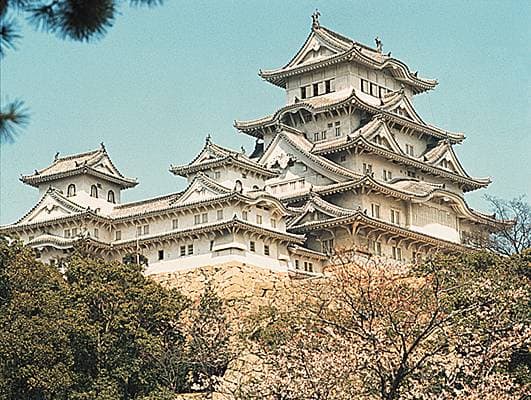 Le château dit « du Héron blanc » (XIVe-XVe siècle), situé à Himeji, dans le sud de Honshu, au Japon.