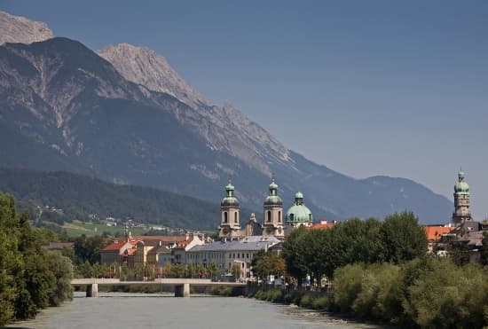 Un aperçu d'Innsbruck, dans le Tyrol, en Autriche : l'Inn et l'église baroque Dom zu St. Jakob, du début du XVIIIe s.