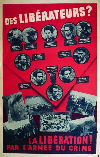 « L'Affiche rouge », distribuée à 15 000 exemplaires en février 1944 par la propagande allemande, visait à discréditer aux yeux de la population française les membres du groupe Manouchian, groupe appartenant au réseau de résistance communiste.