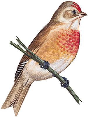 Linotte mélodieuse mâle en période nuptiale (passereau de la famille des fringillidés).