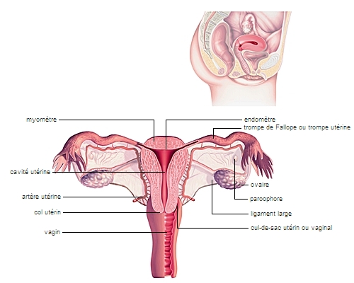 Localisation de l'utérus.Profondément logé dans le petit bassin, en arrière et au-dessus de la vessie, l'utérus est un organe creux, aux parois constituées d'un épais tissu musculaire. Sa partie inférieure, la plus étroite, s'ouvre dans le vagin par le col de l'utérus. Sa partie supérieure, la cavité utérine, est tapissée d'une muqueuse, l'endomètre, qui se modifie au cours du cycle menstruel. Elle est destinée à recueillir l'œuf en cas de fécondation.