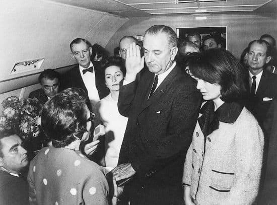Lyndon Johnson, président démocrate des États-Unis de 1963 à 1968. On le voit ici avec, à sa gauche, Jacky Kennedy, prêtant serment le jour de l'assassinat de John Kennedy, le 22 novembre 1963.