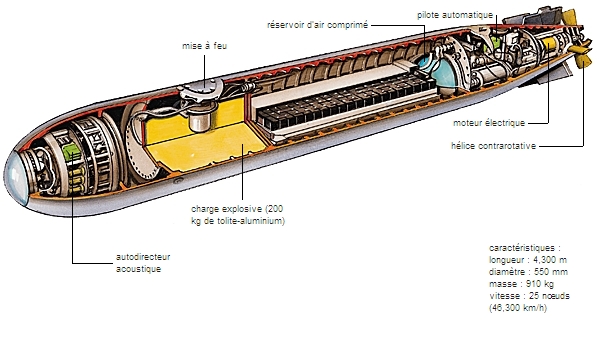 Torpille acoustique (guidée automatiquement sur le navire visé par le bruit des hélices).