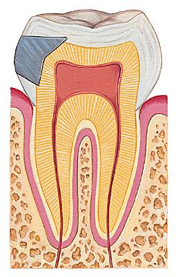 Bloc s'incrustant exactement dans une cavité dentaire préalablement nettoyée et taillée (zone cariée, par exemple) afin de reconstituer la forme anatomique de la dent.