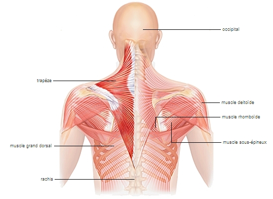 Le muscle trapèze s'insère sur les parties postérieures des vertèbres (cervicales et dorsales) et se termine sur la clavicule et l'omoplate. Il est commandé par le nerf spinal. Il participe au maintien du cou et du rachis dorsal et intervient dans les mouvements d'élévation de l'épaule ainsi que de rotation et d'inclinaison de la tête.