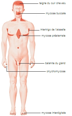 Les mycoses superficielles (cutanées ou cutanéomuqueuses) se manifestent par une atteinte de la peau, des plis ou des espaces entre les doigts (intertrigo), du cuir chevelu (teigne), des ongles (onychomycose), de la bouche ou du vagin. Ce sont, par exemple, des candidoses (muguet, vulvite, balanite, panaris surtout à la main) ou des dermatophytoses (herpès circiné, pied d'athlète, eczéma marginé de Hebra, teignes dont le favus, onychomycose surtout au pied, kérion, sycosis). Les épidermomycoses sont des mycoses touchant l'épiderme, dues principalement aux dermatophytes (champignons appartenant aux genres Epidermophyton, Trichophyton et Microsporum) ou à Malassezia furfur, agent du pityriasis versicolor.