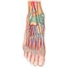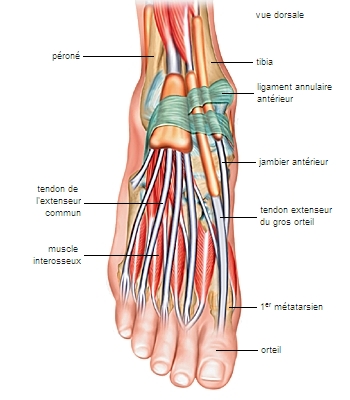 Les muscles du pied sont intrinsèques : un corps charnu interne au pied comprend les muscles qui permettent de bouger les orteils ; il existe également des muscles extrinsèques : le corps charnu situé dans la jambe se prolonge par de longs tendons venant se fixer sur le squelette du pied dont ils assurent le mouvement et le contrôle statique.