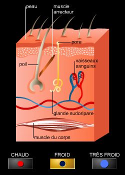 La température du corps est le résultat des phénomènes conjugués de production et de déperdition de chaleur. La chaleur produite, qui s'ajoute à la chaleur reçue de l'extérieur, résulte des réactions chimiques intracellulaires et des contractions musculaires. La déperdition se fait spontanément à travers la peau ; elle est favorisée par la vasodilatation superficielle (dilatation des vaisseaux sanguins de la peau) et par la sudation, suivie de l'évaporation de la sueur. Le maintien d'une température à peu près constante (homéothermie) dans une étroite fourchette de valeurs (de 36,5 °C à 37,3 °C de température rectale) permet aux cellules de l'organisme de vivre dans un milieu équilibré malgré les variations de température du milieu extérieur.