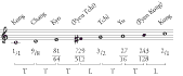 Sous chaque note est indiquée la fraction caractéristique de l'intervalle formé avec la tonique rapport des fréquences , si toutes les quintes sont justes.