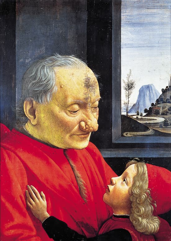 La pénétration du naturalisme flamand dans le milieu florentin de la fin du xve s. est avérée, notamment par quelques portraits qui obéissent à la formule nordique du buste et du visage de trois quarts. Contemporain de Botticelli – dont le Portrait de jeune homme à la médaille (1466) traduit un lien de parenté encore difficile à préciser entre la figure principale et la médaille de Cosme de Médicis –, Domenico Ghirlandaio affirme nettement dans ce tableau le rapport affectif et filial entre les deux personnages, peints avec minutie.