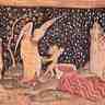 Au château d'Angers, ensemble de tapisseries historiées (sept pièces totalisant 107 m de long et regroupant 69 scènes [plus de 80 à l'origine]), exécutées, à partir de 1374, par le tapissier parisien Nicolas Bataille, pour Louis Ier d'Anjou, sur des cartons de Jean de Bruges, peintre de Charles V.