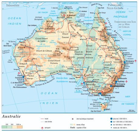 Vaste comme quinze fois la France, l'Australie est encore globalement peu peuplée. C'est un pays désertique, en dehors des bordures est et sud, au climat tempéré, où se concentrent, ponctuellement, les hommes. Canberra, création artificielle, est la seule grande ville de l'intérieur. Les cinq principales villes (Sydney, Melbourne, Brisbane, Adélaïde et Perth), toutes littorales, regroupent en effet 60 % de la population australienne, urbanisée à plus de 85 %. Les Aborigènes représentent 2 % de la population, moins que la minorité asiatique (en pleine expansion).