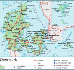 État d'Europe septentrionale baigné par la mer du Nord, le Danemark est séparé de la Norvège par le Skagerrak et de la Suède par le Cattégat. Il est limité au sud par l'Allemagne.