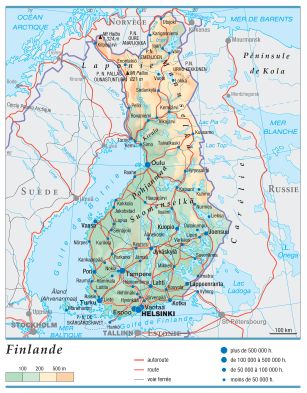 La Finlande est l'un des pays les moins peuplés d'Europe (15 habitants par km2). Inégalement répartie, la population se concentre pour les deux tiers dans le Sud, moins hostile, sur les côtes des golfes de Botnie et de Finlande. Elle est aux deux tiers urbaine, et les deux langues officielles sont le finnois (93 %) et le suédois (6 %). La minorité suédoise, en diminution, dispose d'un parti politique, d'écoles et d'institutions particulières. Le Grand Nord est habité par 6 500 Lapons, dont environ 2 500 sont sédentaires. La plupart vivent dans les régions bordant la Suède, la Norvège et la Russie. L'élevage du renne – qui constitue, pour 40 % des Lapons, la source de revenus la plus importante –, la pêche, la chasse, l'artisanat et le tourisme sont leurs principales ressources.