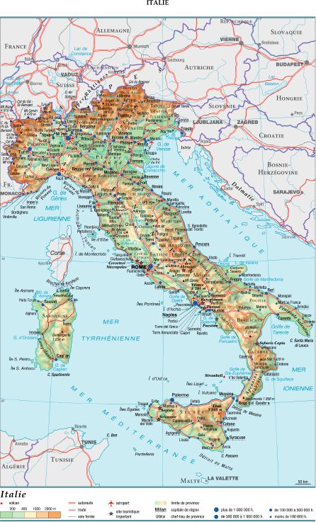 État d'Europe méridionale baigné par la mer Méditerranée (mer Tyrrhénienne à l'ouest, mer Ionienne au sud, mer Adriatique à l'est), l'Italie est limitée au nord-est par la Slovénie, au nord par l'Autriche et la Suisse, au nord-ouest par la France.