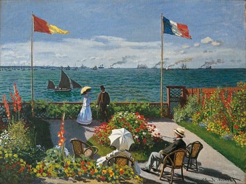 Dans la seconde moitié des années 1860, Monet se partage entre la région parisienne et la Normandie. Il travaille beaucoup (Camille, ou femme à la robe verte, 1866 ; Femmes au jardin, 1867 ; Jardin à Sainte-Adresse, id. ; Bain à la Grenouillère, 1869 ; la Plage de Trouville, 1870), en développant un style proche de celui d'Édouard Manet, avec une palette aux couleurs chaudes et éclatantes. La lumière apparaît alors en taches sans que le dessin en soit encore affecté.