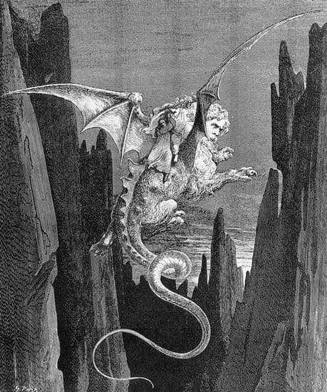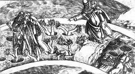 L'Enfer, gouffre provoqué par la chute de Lucifer, a la forme d'un gigantesque entonnoir dont la plus large circonférence a pour centre Jérusalem (lieu de la passion du Christ) et dont la pointe inférieure se trouve au centre de la terre (lieu dont la totale obscurité est négation de Dieu, qui est lumière). Il est divisé en 9 terrasses, ou cercles concentriques. Aux antipodes de Jérusalem surgit l'île montagneuse du Purgatoire, dont la masse correspond à celle de la terre, déplacée par la chute de Lucifer. La base de cette montagne (ou Antépurgatoire) plonge dans l'atmosphère, au-dessus de laquelle s'élève la cime du Purgatoire proprement dit, échelonné en 7 terrasses, ou girons, au sommet desquels s'étend le luxuriant plateau du Paradis terrestre, d'où Dante et Béatrice s'envolent successivement à travers les 9 ciels du Paradis, jusqu'à l'empyrée.