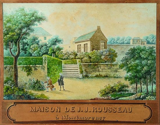 Rousseau quitte Paris pour méditer à la campagne, non loin de Montmorency, à l'Ermitage de Mme d'Épinay. En 1757, il se fâche avec Diderot, qui, dans le Fils naturel, stigmatise les ermites et affirme que « l'homme de bien est dans la société ». La même année, il vit un amour malheureux et terrible avec Mme d'Houdetot (que l'on dira être le modèle de la Julie de la Nouvelle Héloïse), s'incline finalement devant la passion de son ami Saint-Lambert pour la jeune femme, défraie la chronique et quitte l'Ermitage pour s'installer dans les environs, à Montlouis, dans une maison en ruine, avec Thérèse.