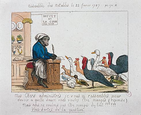 Le calcul se révèle faux. Les notables réunis à Paris (22 février 1787) sont très vite sous l'emprise des courtisans hostiles à Calonne. Celui-ci, dépourvu de l'aide et des conseils de Vergennes, qui meurt quelques jours avant l'ouverture de l'assemblée des notables, commet la maladresse de présenter son projet en condamnant l'ordre existant. Traitant des causes profondes du malaise financier, il dénonce d'emblée « les abus des privilèges pécuniaires, les exceptions à la loi commune qui ne peuvent affranchir une partie des contribuables qu'en aggravant le sort des autres », il condamne « l'inégalité générale dans la répartition des subsides », il proteste contre « le déshonneur imprimé au commerce des premières productions », contre « les bureaux de traites intérieures et ces barrières qui rendent les diverses parties du royaume étrangères les unes aux autres », contre « les droits qui découragent l'industrie, ceux dont le recouvrement exige des frais excessifs et des préposés innombrables… ».