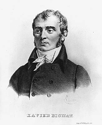 Marie François Xavier Bichat est considéré comme l'initiateur de l'anatomie générale, car, plus que les organes eux-mêmes, il étudia les tissus qui les constituent. Il contribua également aux progrès de l'embryologie et définit la vie comme l'ensemble des propriétés vitales résistant aux processus physico-chimiques de dégradation. Disparu, à trente ans, Bichat, qui fut médecin à l'Hôtel-Dieu à Paris, laissa plusieurs ouvrages, dont Recherches physiologiques sur la vie et la mort (1799) et Anatomie générale (1801). Sa doctrine des propriétés vitales est contenue tout entière dans sa définition : « La vie est l'ensemble des fonctions qui résistent à la mort ».