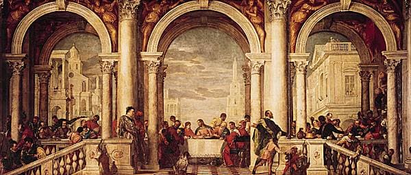 Les Pèlerins d'Emmaüs (Louvre), de 1560 environ, inaugurent un type de composition en largeur, à grand déploiement de figures, incorporant des portraits et des scènes de genre. C'est un prélude aux immenses toiles peintes pour des réfectoires de communautés, et représentant des festins fastueux dans le cadre d'architectures inspirées de Sansovino et de Palladio : d'abord le Repas chez Simon des Santi Nazario e Celso de Vérone (Galleria Sabauda de Turin) ; en 1562-1563, les Noces de Cana de San Giorgio Maggiore de Venise (Louvre), dont l'ampleur et la richesse en détails sont exceptionnelles ; dans une composition plus articulée, en 1572, la Cène de saint Grégoire du sanctuaire du Monte Berico, près de Vicence, puis le Repas chez Simon le Pharisien des Servites de Venise (offert à Louis XIV, Versailles) ; en 1573, enfin, le Repas chez Lévi des San Zanipolo de Venise (Accademia), dont les détails profanes valurent au Véronèse d'être inquiété par l'Inquisition.
