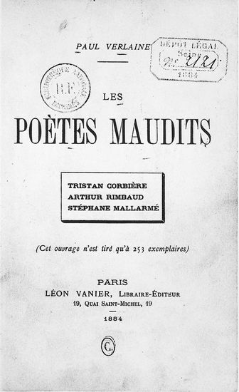 En 1884, alors qu'il sombre de nouveau dans l'alcool, Verlaine publie Jadis et Naguère, qui compte quelques chefs-d'œuvre, dont son « Art poétique ». La même année, il fait paraître les Poètes maudits, étude consacrée notamment à Tristan Corbière, à Rimbaud, à Mallarmé et à lui-même – sous l'anagramme du « Pauvre Lélian » –, ce qui lui vaudra d'être promu, malgré lui, initiateur du symbolisme.