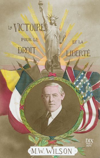 Réélu en 1916 sur un programme de paix, Woodrow Wilson a été contraint d'engager son pays dans une guerre totale. Il ne manque pas de distinguer soigneusement les buts de guerre américains des objectifs européens ; il est un associé, et non l'allié des Alliés, et le fait savoir par son discours des « Quatorze Points » prononcé le 8 janvier 1918 devant le Congrès :