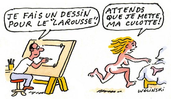 La majeure partie de la carrière de Wolinski se fait toutefois dans la grande presse, où ses dessins d'un humour caustique commentent l'actualité (→ caricature). Il dessine pour l'Humanité, Libération, le Nouvel Observateur, Paris-Match, le Journal du dimanche, Charlie Hebdo, ses dessins étant ensuite regroupés sous forme d'albums (Je ne veux pas mourir idiot, 1968 ; C'est dur d'être patron, 1977 ; À bas l'amour copain, 1980 ; Mes aveux, 2000 ; Salut les filles !, id.). En 2005, son œuvre a été couronnée par le Grand Prix de la ville d'Angoulême (festival d'Angoulême). Wolinski a par ailleurs participé à l’édition anniversaire 2010 du Petit Larousse en illustrant des mots de la langue française.